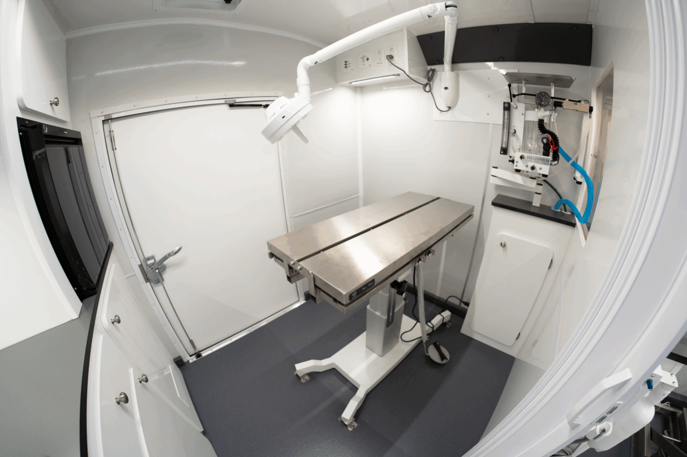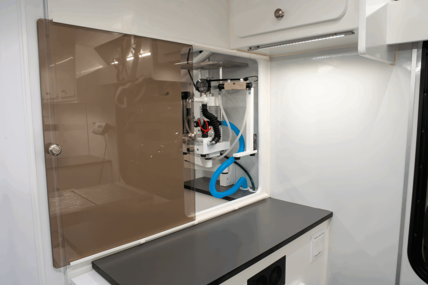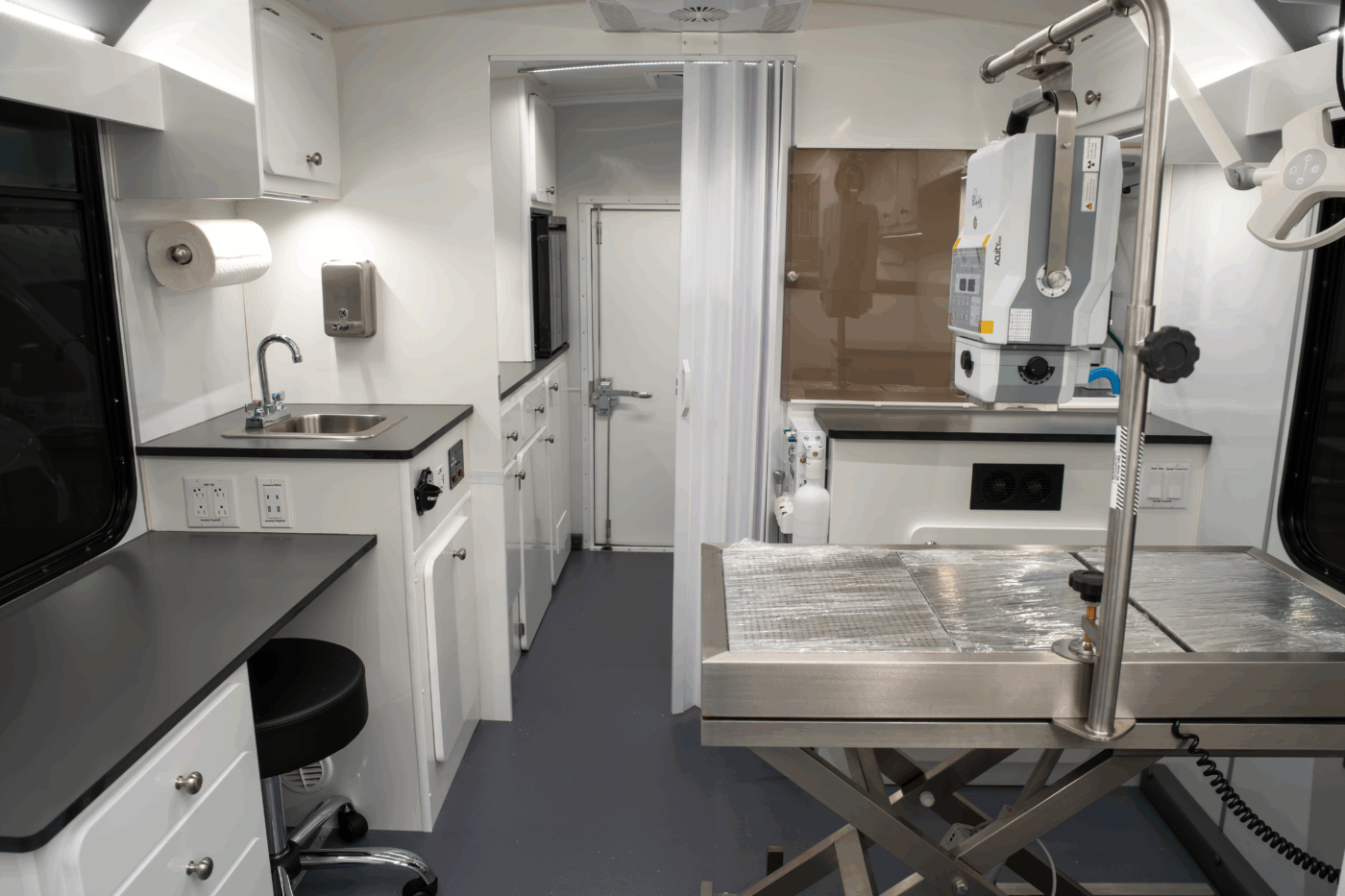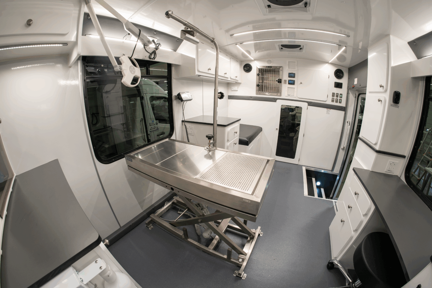 - Wag’n Tails CleanPower System™ – 1,200-amp-hour lithium battery pack with internal heater, remote monitor display, upgraded 15,000 BTU rooftop air conditioner, dual 3000W inverters, solar panels on roof, variable speed K9II Dryer and additional electric heater in rear area. Onan Generator not included with Wag’n Tails CleanPower System option. (Access to power outlet required for nightly charging when not in use). For more details go to www.mobilevetclinic.com/CleanPowerSystem