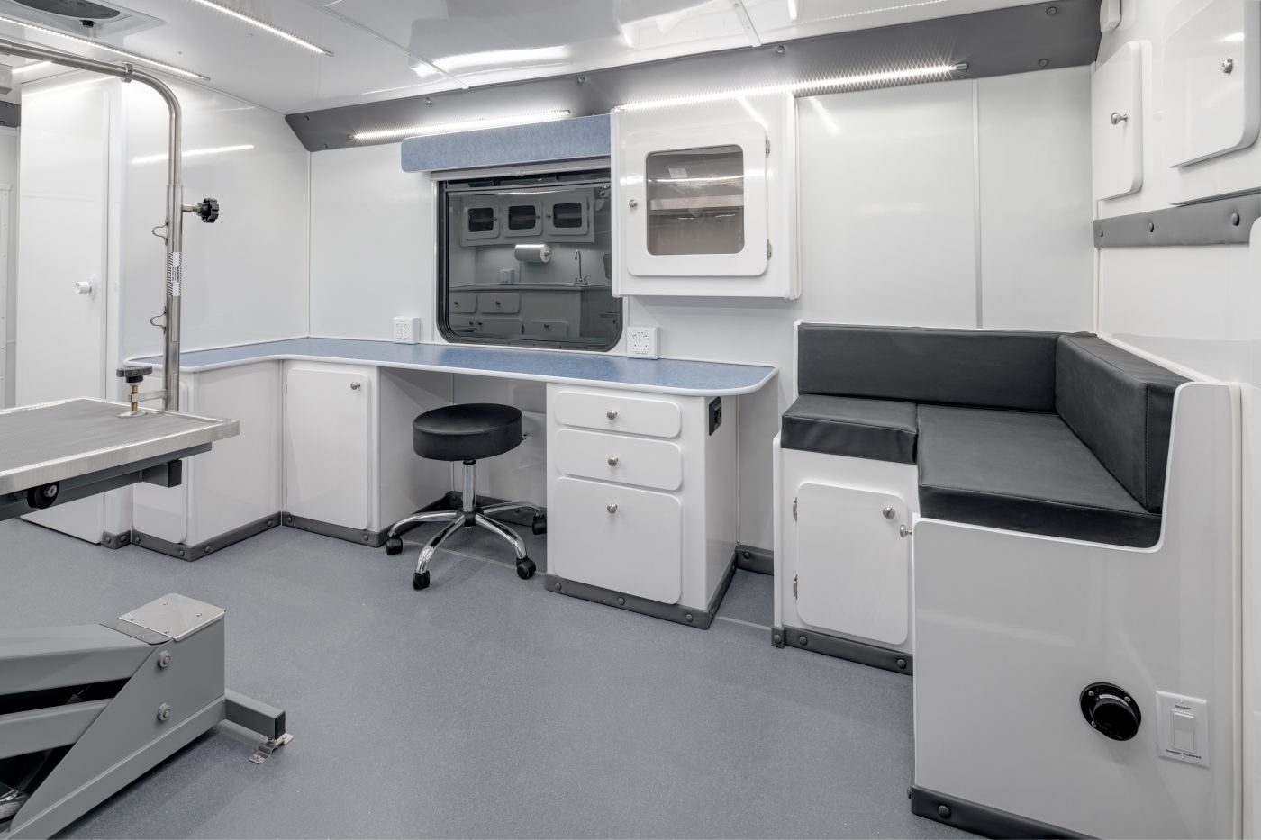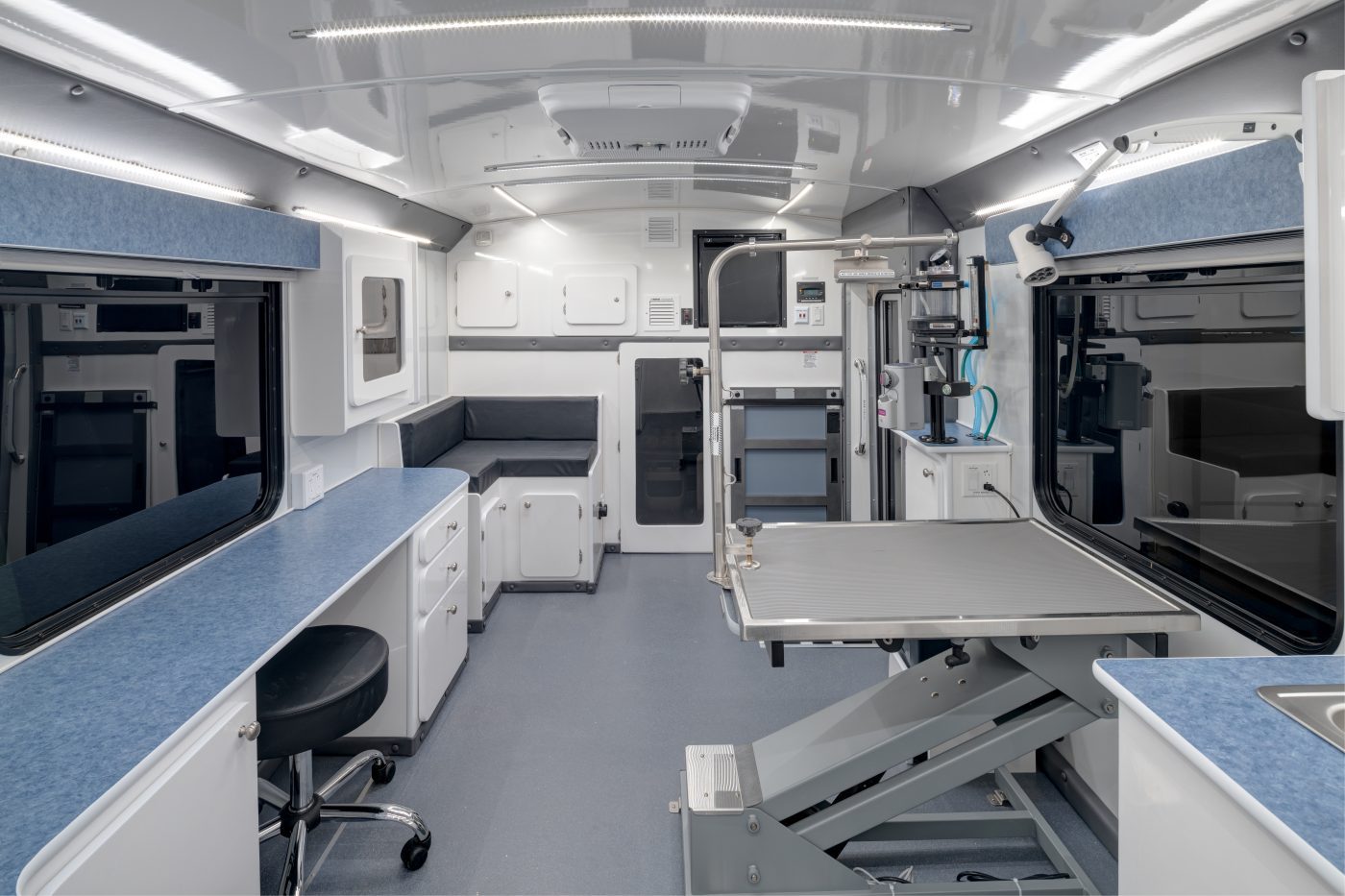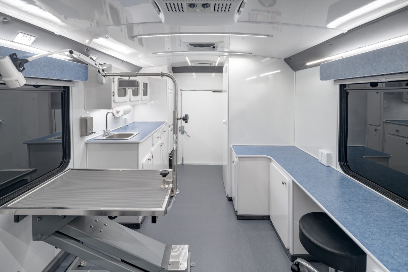 The Elite Vet Classic is our largest specialty vehicle designed, engineered, and manufactured specifically for veterinarians working with 1-2 techs and seeking as much workspace and storage capacity as possible. Built using a Ford Cutaway E-450 chassis and Glaval Empty Bus Shell, this heavy-duty, highly durable, and spacious veterinary vehicle is over 25 feet long with nearly 120 square feet and a bathroom.