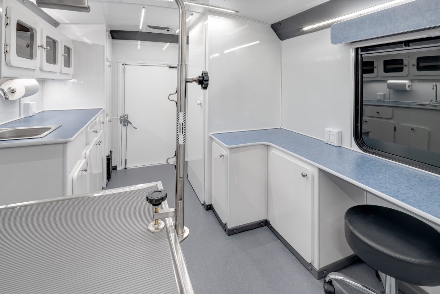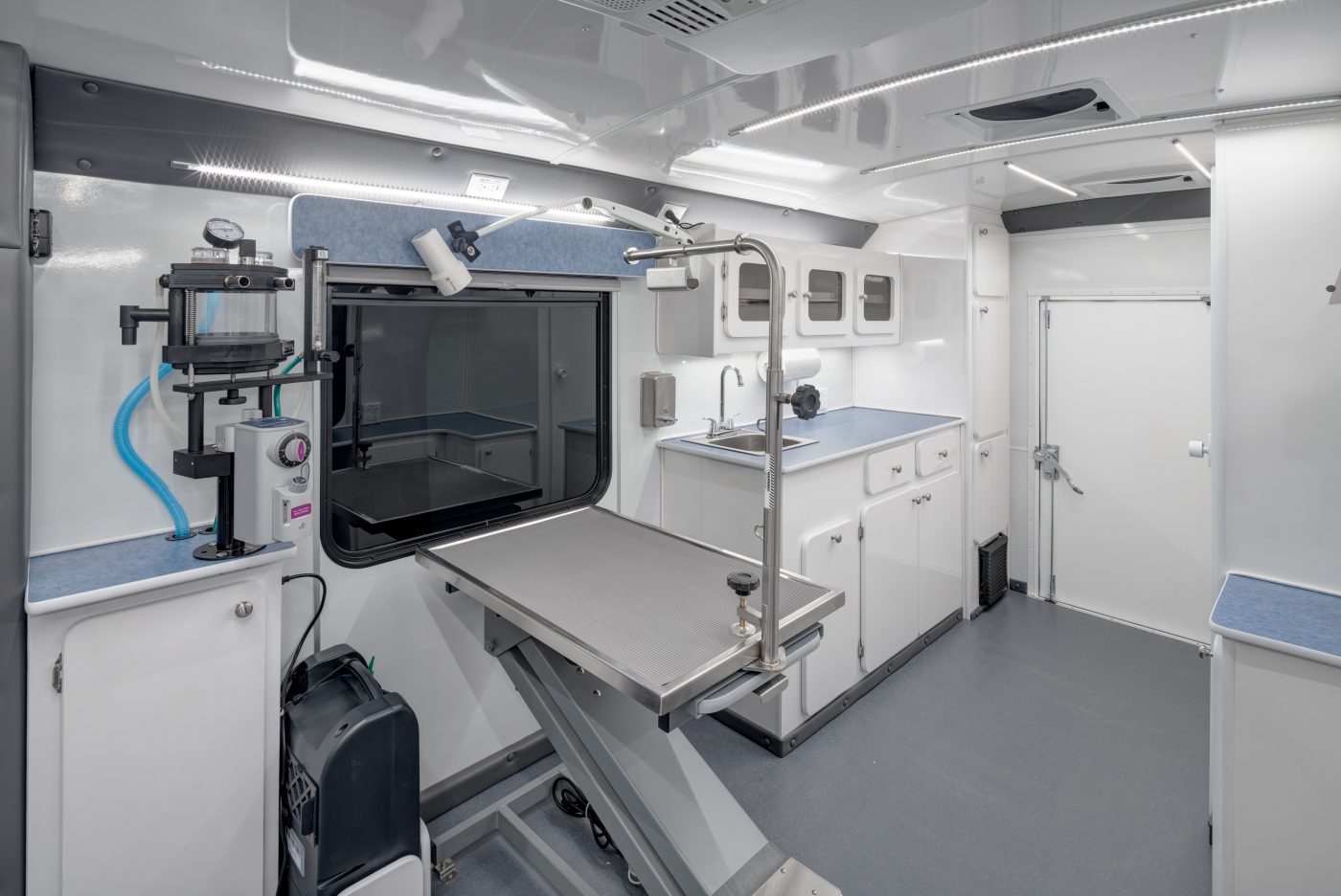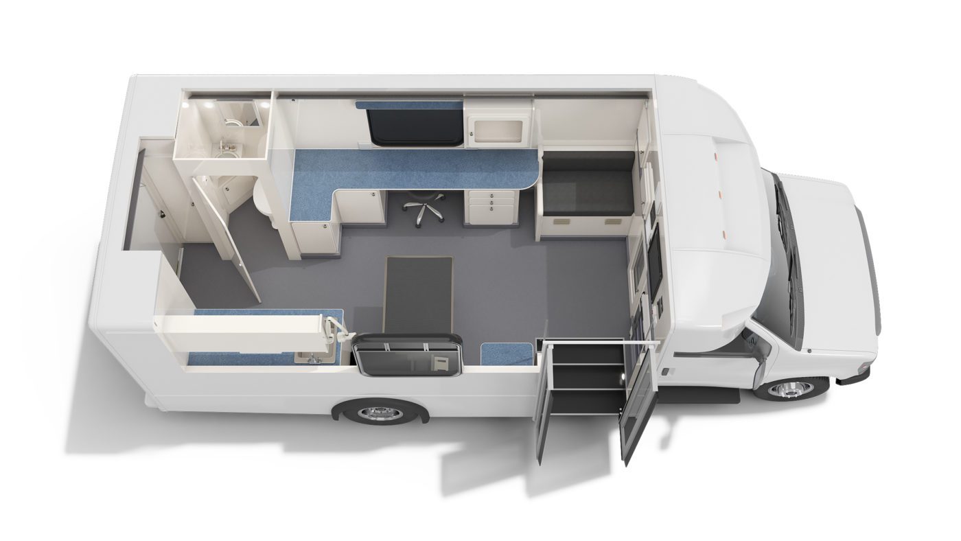 The Elite Vet Classic is our largest specialty vehicle designed, engineered, and manufactured specifically for veterinarians working with 1-2 techs and seeking as much workspace and storage capacity as possible. Built using a Ford Cutaway E-450 chassis and Glaval Empty Bus Shell, this heavy-duty, highly durable, and spacious veterinary vehicle is over 25 feet long with nearly 120 square feet and a bathroom.